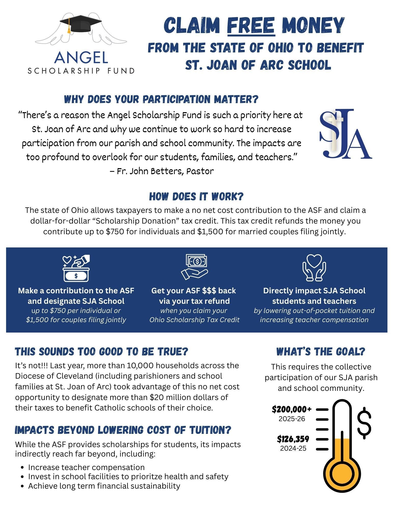 Eligible tax payers can contribute and claim an Ohio tax credit up to $750 ($1,500 married filing jointly). Be sure to designate St. Joan of Arc School when making a contribution.
