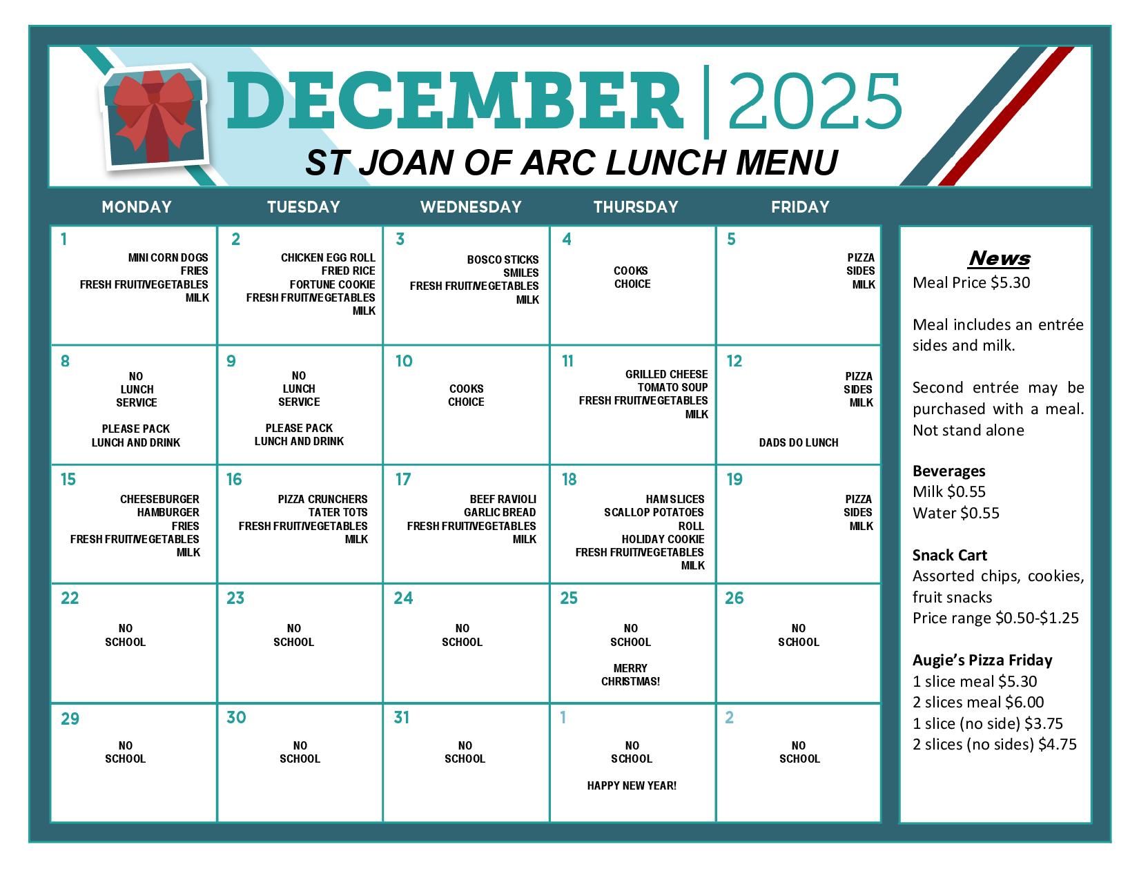 St. Joan of Arc is happy to provide hot lunches to students. Please see below for the current menu, and use the Meal Magic button to order school lunches and put money on your child(ren)'s accounts.